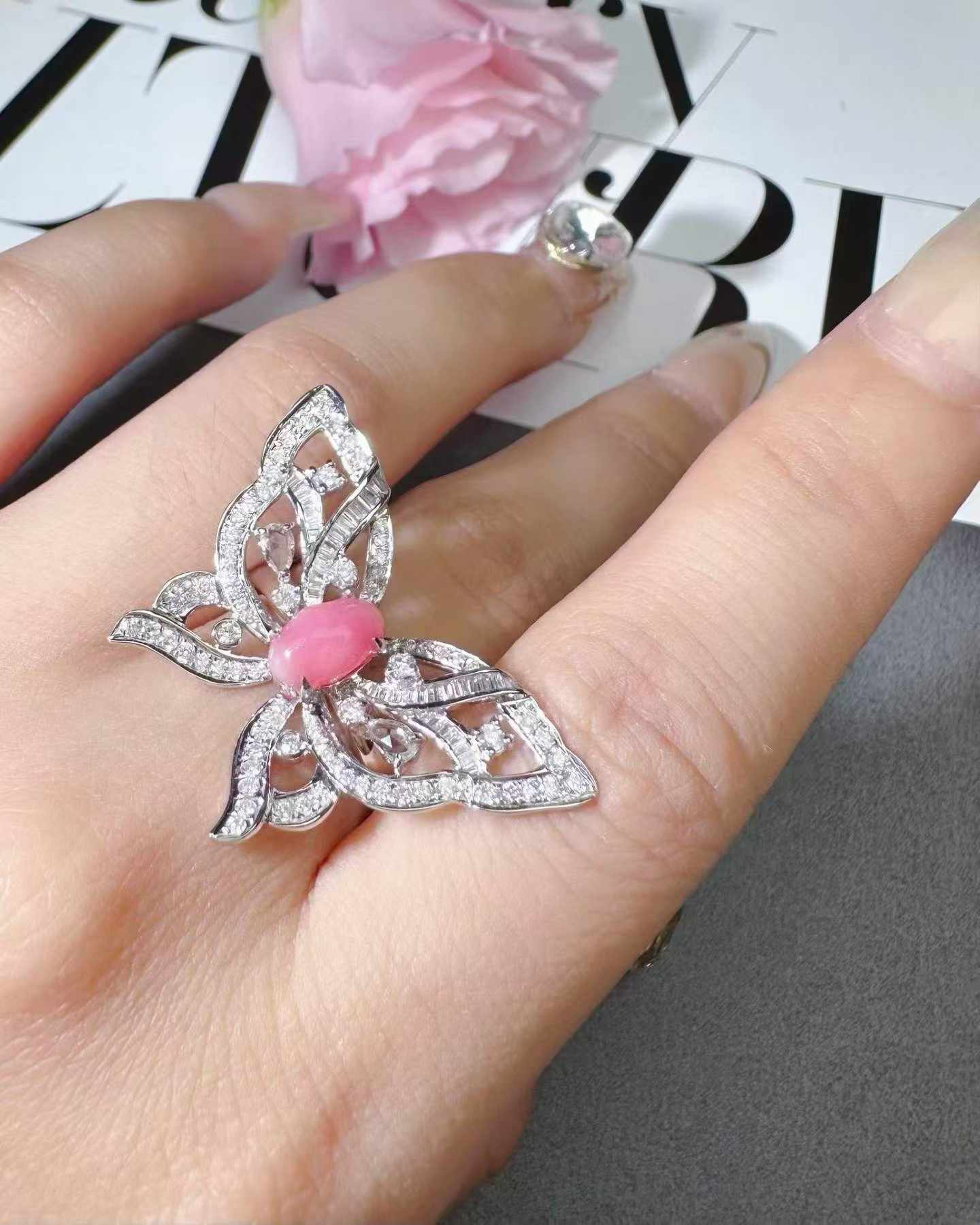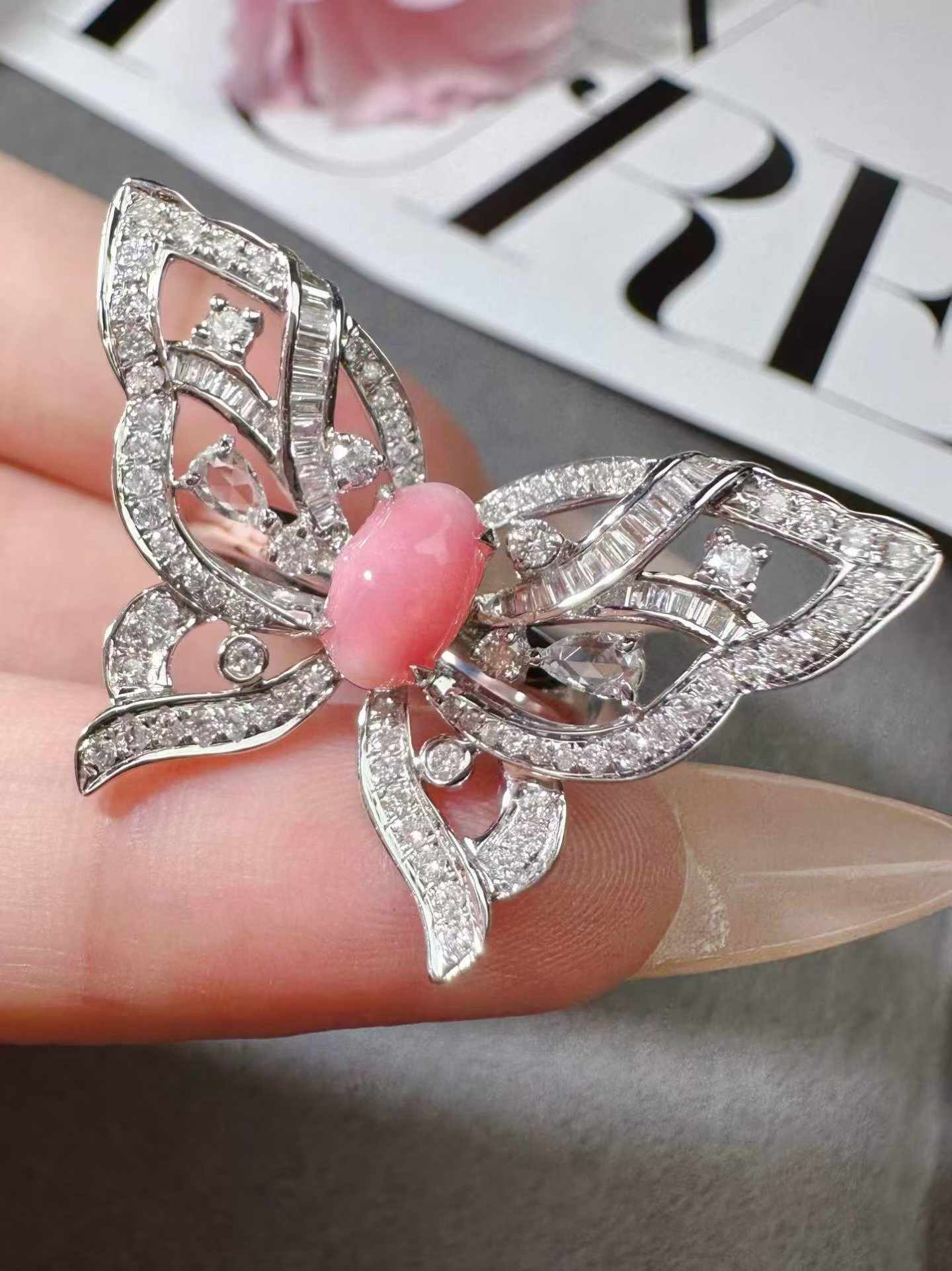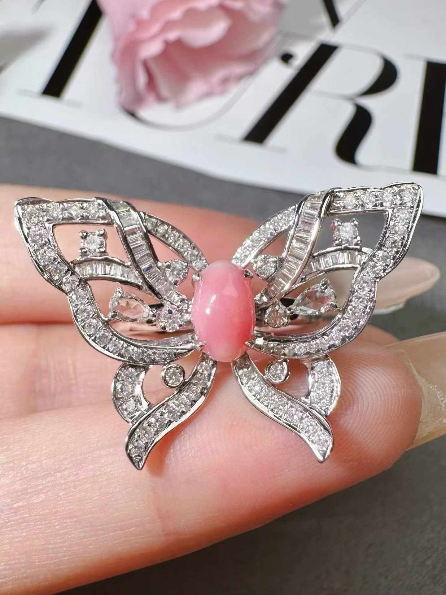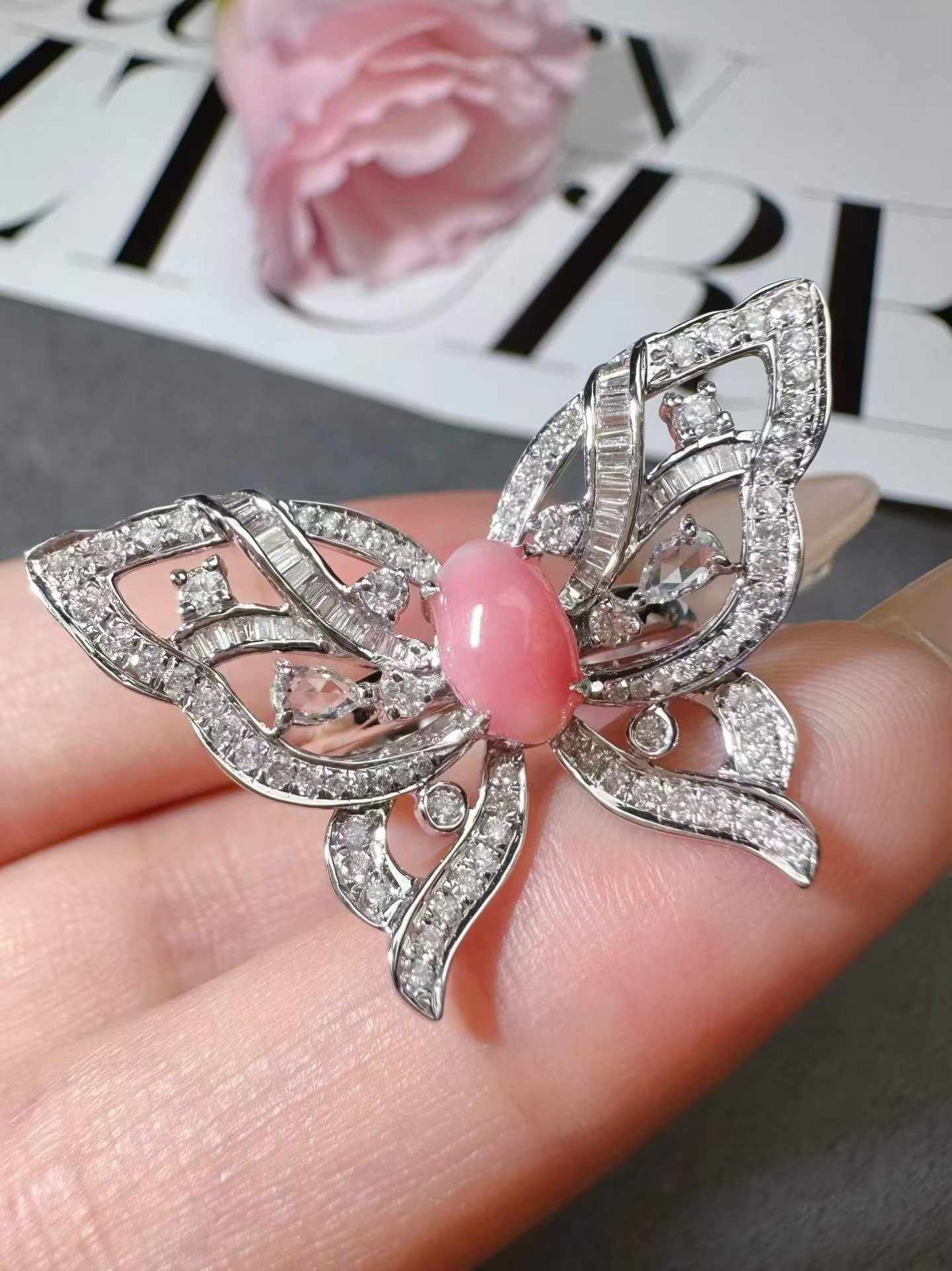 A delicate butterfly set with a soft pink conch pearl, accented by sparkling diamonds.