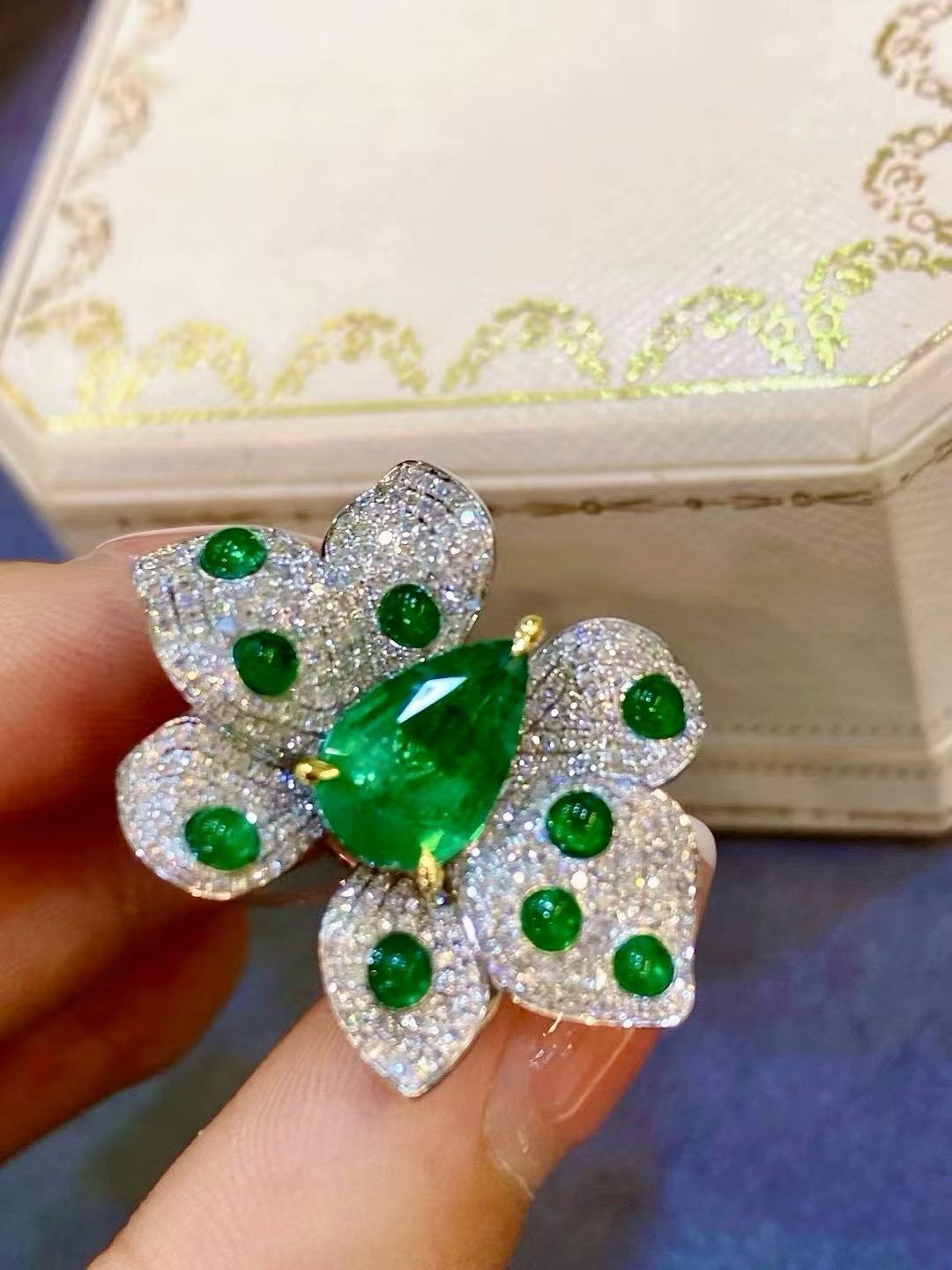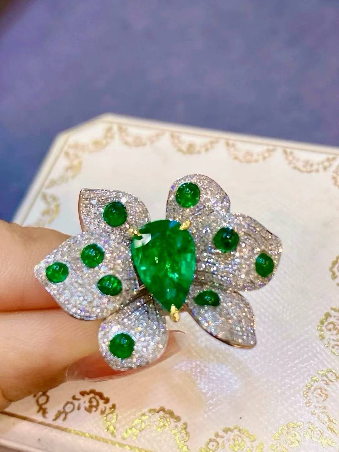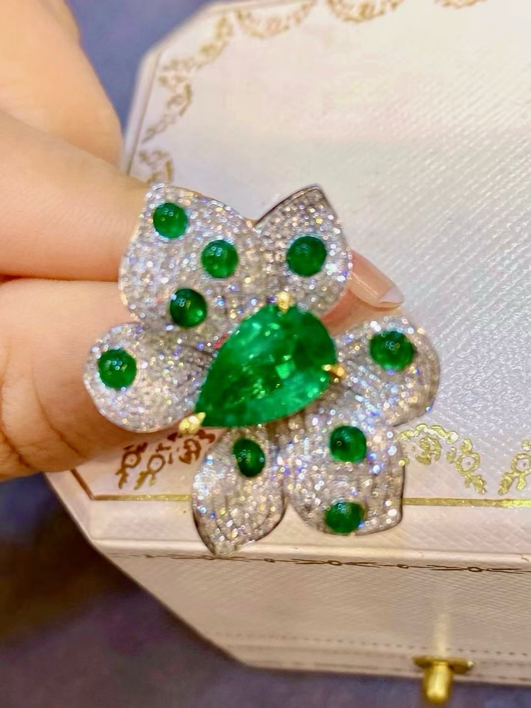 A striking butterfly ring centered with a vivid green gemstone, surrounded by shimmering diamonds that amplify its brilliance. Bold, radiant, and designed to stand out from every angle.