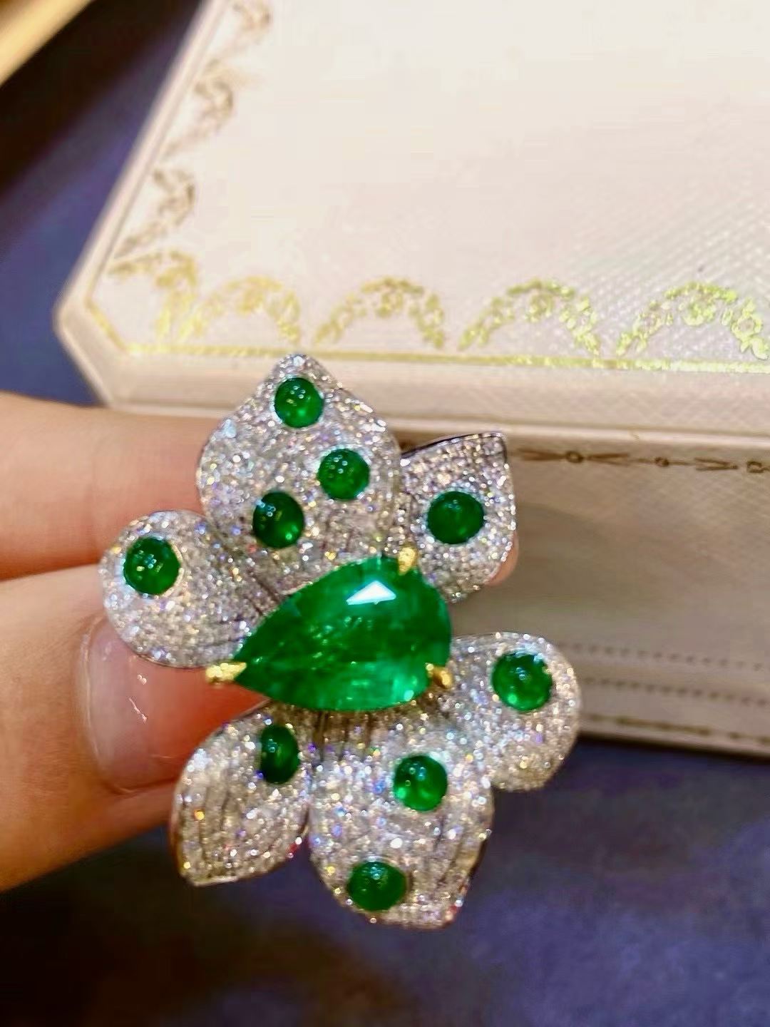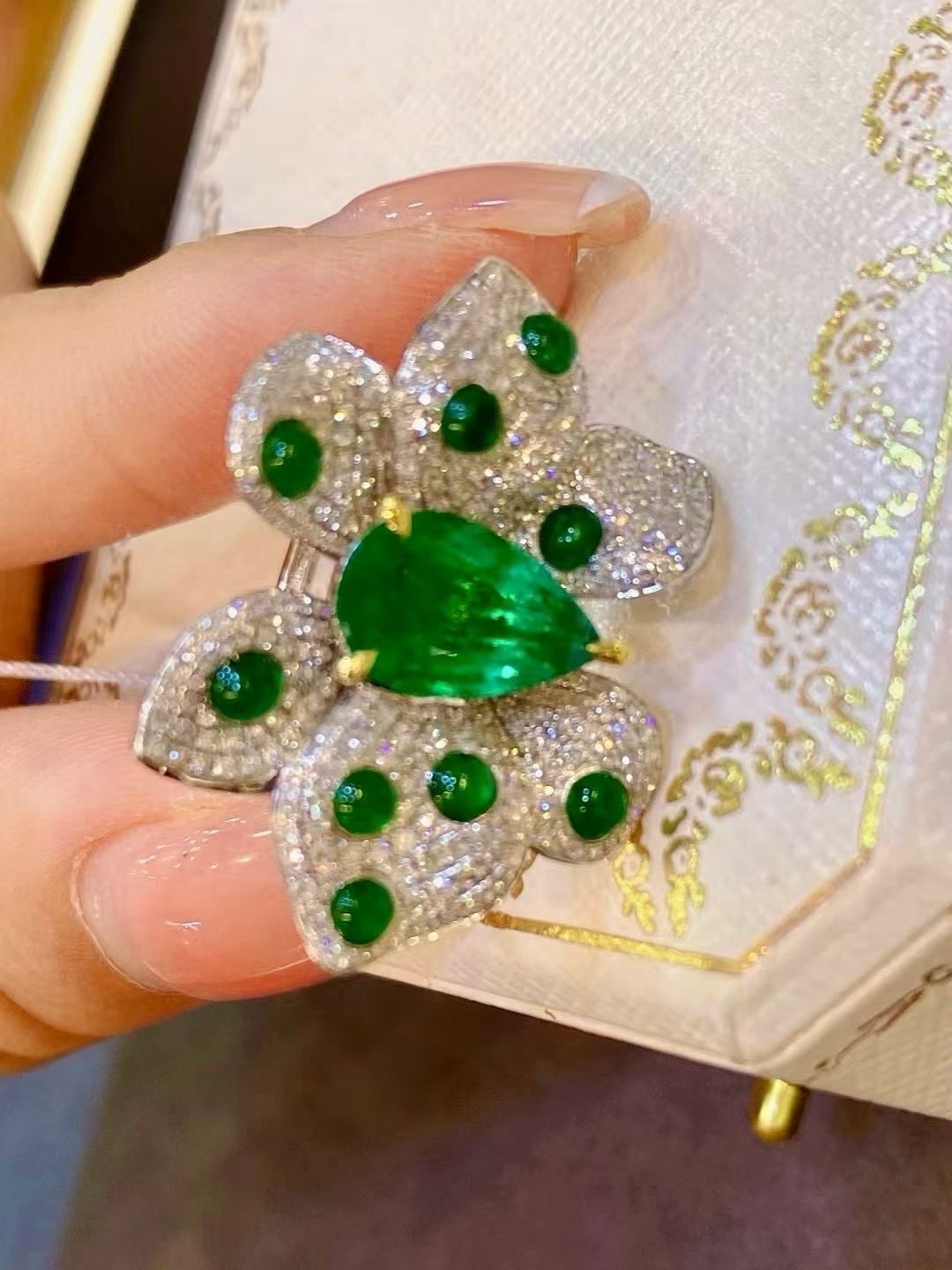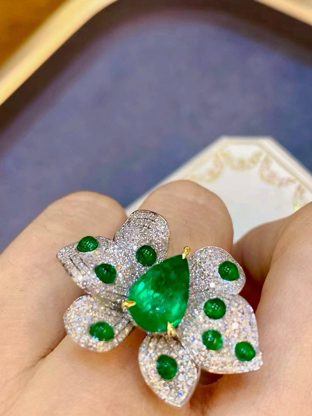 A striking butterfly ring centered with a vivid green gemstone, surrounded by shimmering diamonds that amplify its brilliance. Bold, radiant, and designed to stand out from every angle.
