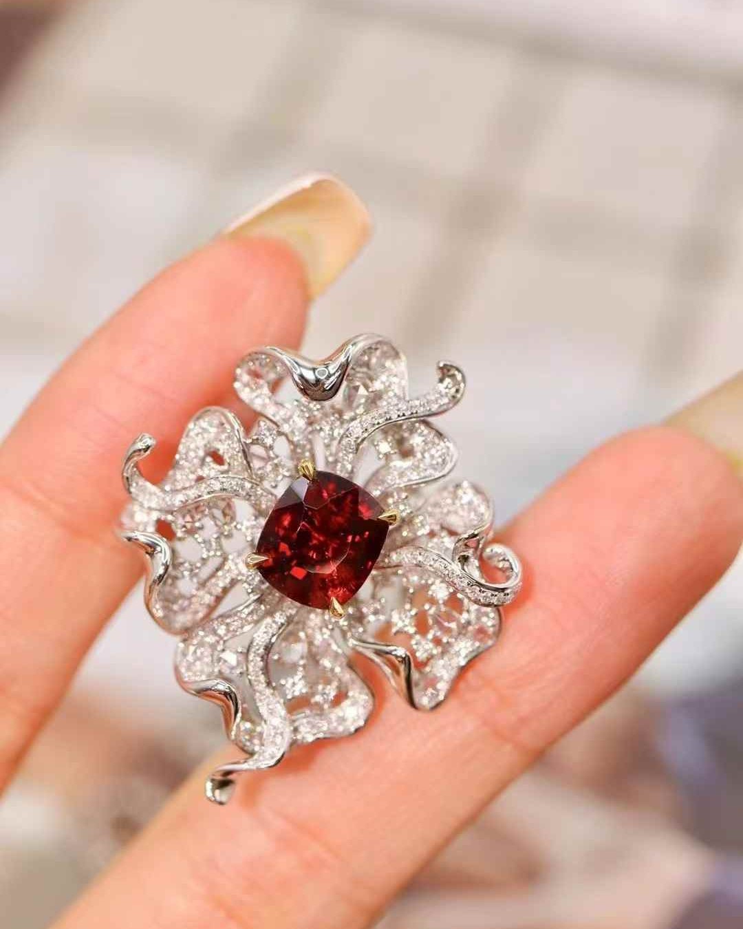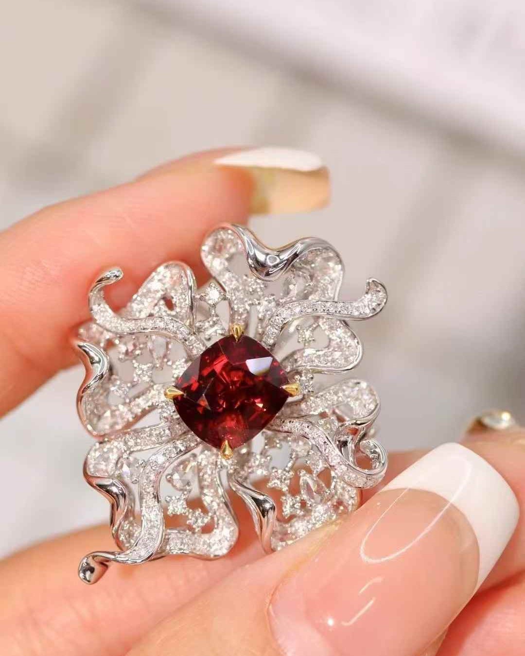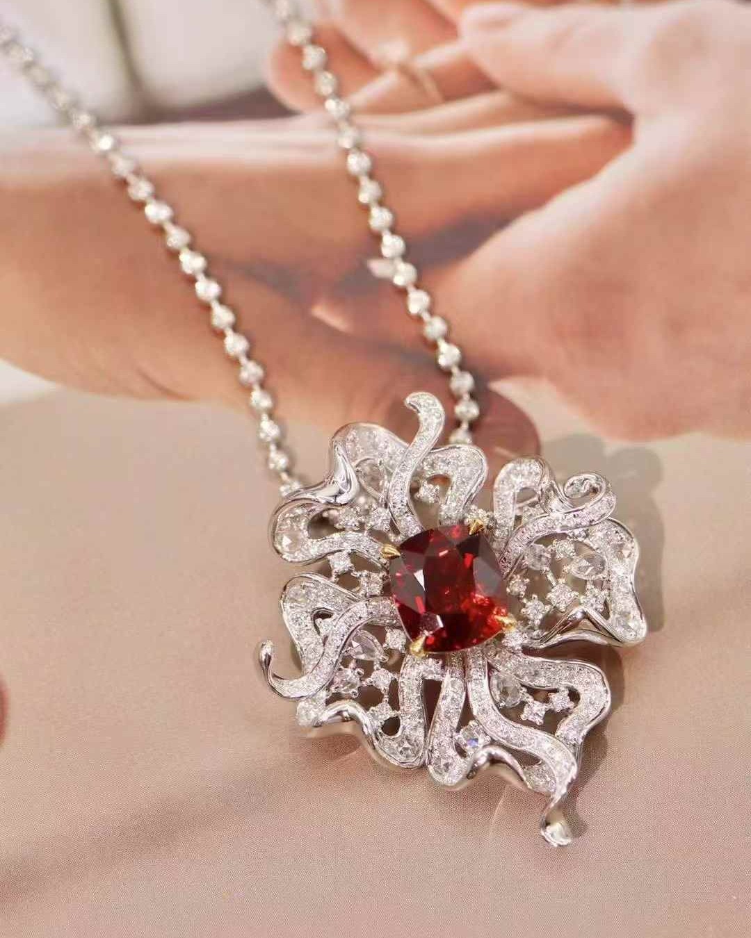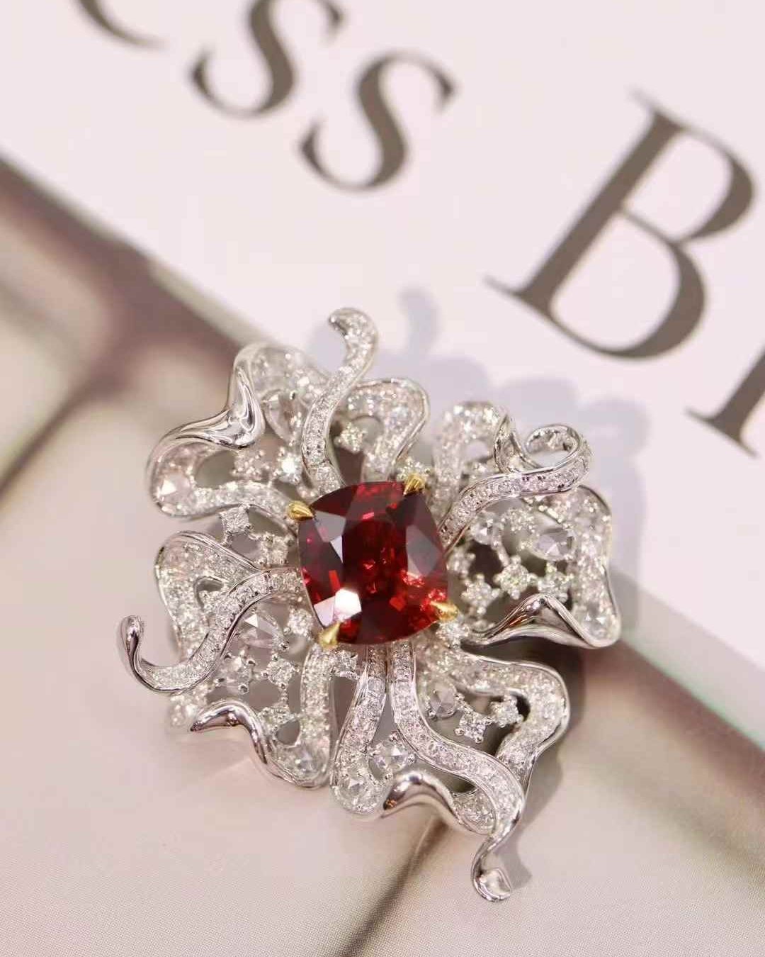 Featuring a vivid pigeon blood red spinel, this rare unheated gemstone radiates rich, saturated color. Designed as a versatile brooch and pendant.